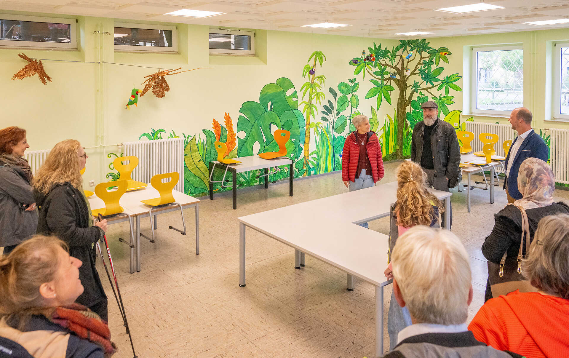 Patricia Spilger, stellvertretende Schulleiterin der Dr.-Vits-Schule, führte nicht nur die Gäste durch die Schule, sie ging auch auf das erfolgreiche Projekt Kunstgrundschule ein. Was dabei herausgekommen ist, sei in allen Bereichen der Schule sichtbar, sagte sie und gab einen Überblick, was alles entstanden sei. Das alles sei nur möglich gewesen, da „der Geist der Kunst fest in den Köpfen der Kinder, Lehrinnen und Lehrer sowie im Haus verankert ist.“ Ohne das Kunstnetz wäre dies nie möglich gewesen, dankte sie allen Künstlerinnen und Künstlern, allen voran Christiane Leuner.